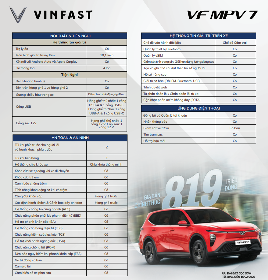 Mức giá xe VF MPV 7 được niêm yết cực kỳ hấp dẫn là 819.000.000 VNĐ (đã bao gồm VAT). Đặc biệt, xe được áp dụng đầy đủ các ưu đãi từ chương trình “Mãnh liệt vì tương lai Xanh” giảm 6% trên giá niêm yết của VinFast trong năm 2026.